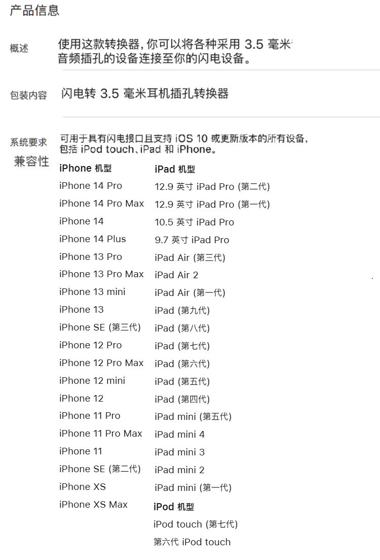 Apple 闪电转3.5毫米耳机插孔转换器 适用iPhone11/12/13/14系列