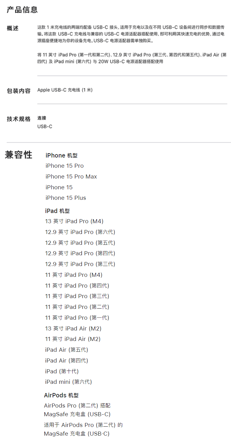 Apple 60W USB-C 充电线1m 适用IPad Mini6/Air5/Pro/iphone15