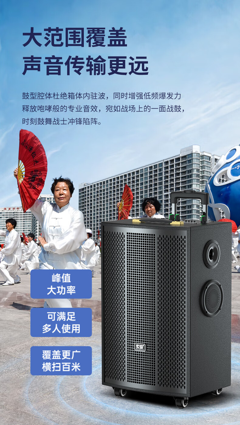 索爱(soaiy)升级4个轮大功率15喇叭重低音广场舞音响移动家用户外K歌蓝牙拉杆便携式音箱带无线话筒15英寸
