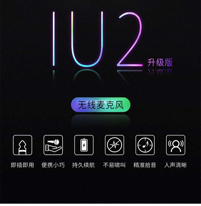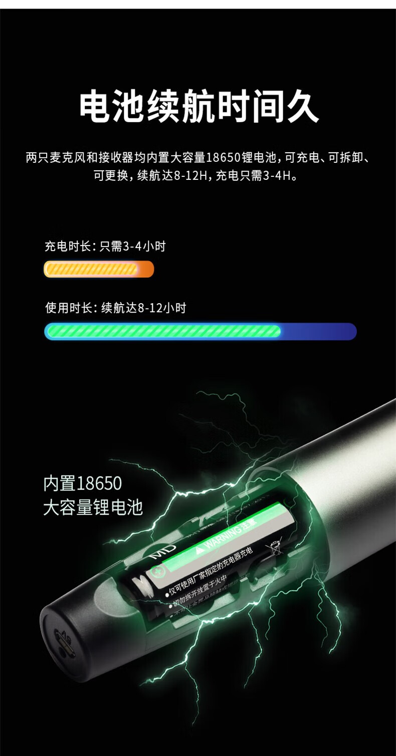 麦克风和接收器均内置大容量18650锂电池,即插即用一拖二麦克风,抗干扰,防啸叫,智能降噪